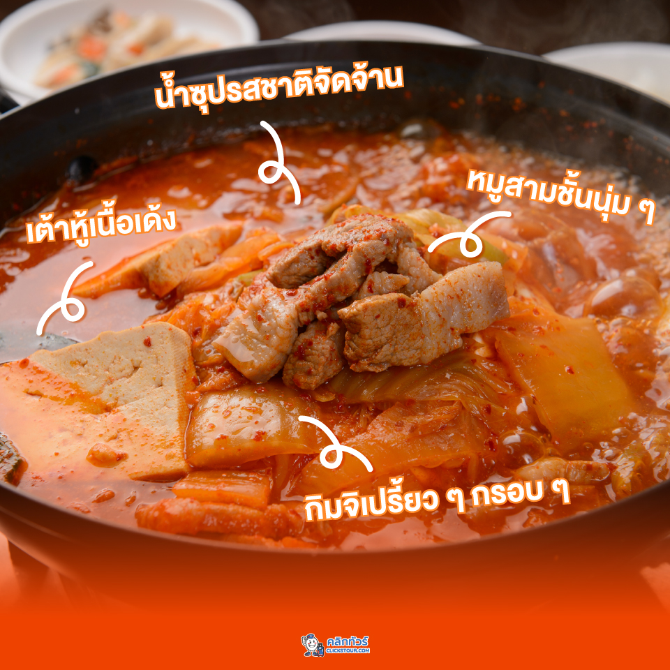 กิมจิ เต้าหู้ เนื้อสัตว์ ต้นหอม และพริกป่นเกาหลี ซ้ำซุปมีรสเปรี้ยวนิด ๆ